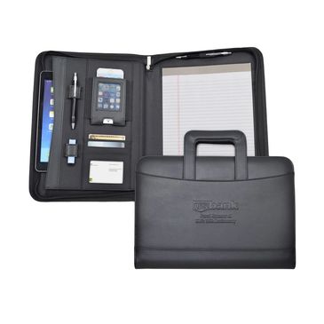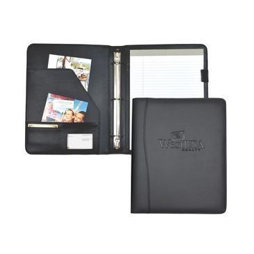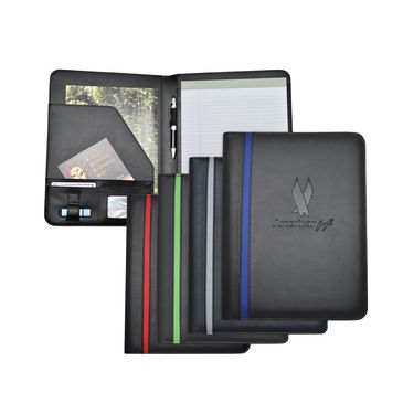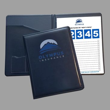WHAT MAKES THESE PADFOLIOS STANDOUT AT YOUR NEXT MEETING? Padfolios have been around for a long time. What we have done is given them a NEW twist. Instead of just including a blank, lined 8/5" x 11" notepad, we print all the pages with your company's information and insert them into your padfolios. We can design it for you or your art department can create it. PLUS ... we include a personalized grip pen with each EVENTFOLIO. See our sample image below. Call or complete our contact page.